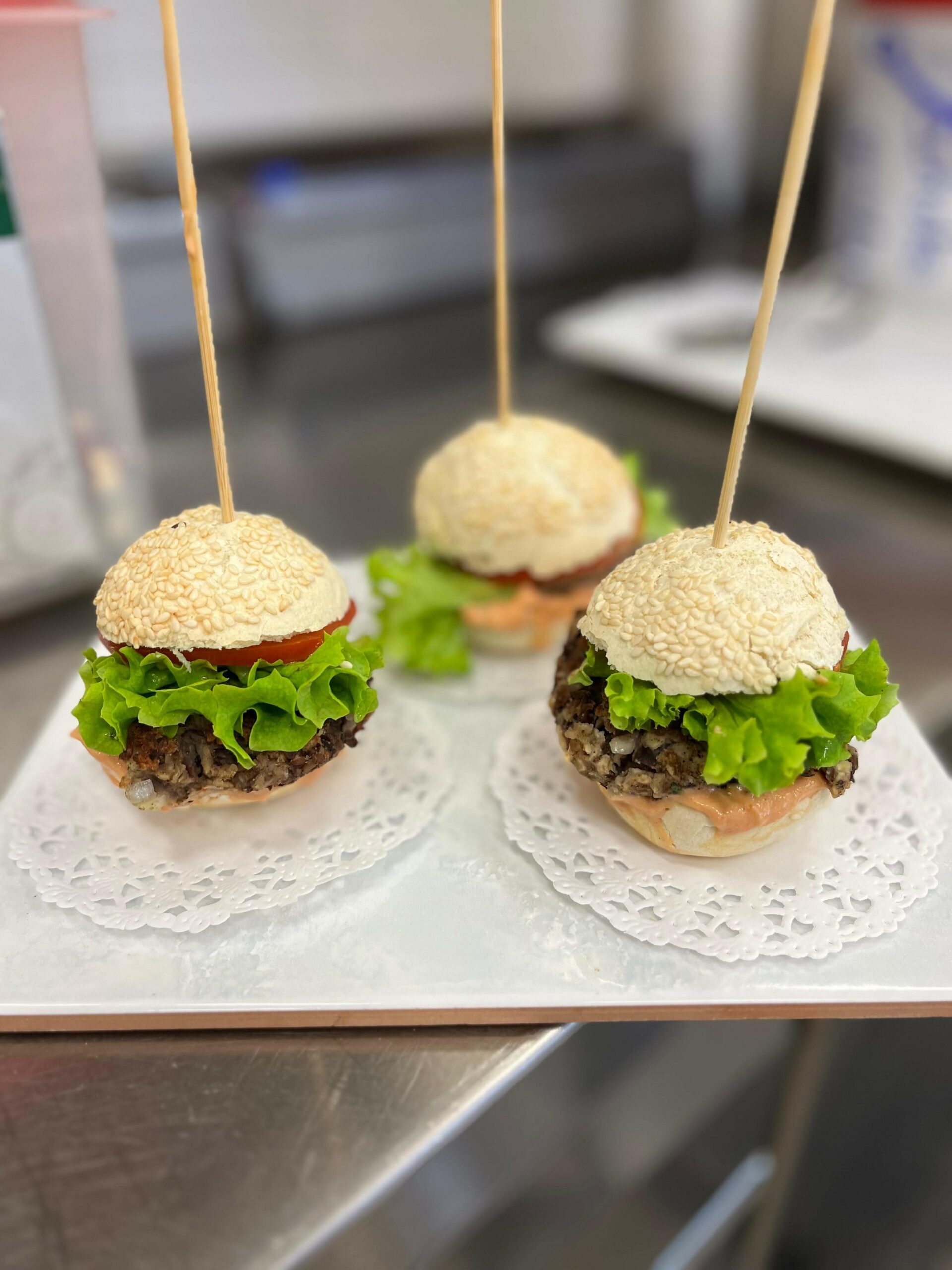 1Für die Burgerbuns: Alle Zutaten (außer Sesam) zu einem geschmeidigen Teig verarbeiten und ca. 30 Minuten rasten lassen, Backrohr auf 180°C vorheizen 2In der Zwischenzeit für die Burgerpatties: Leinsamen in zwei Esslöffel Wasser einweichen, Zwiebel und Knoblauch fein schneiden und in Öl glasig anschwitzen 3Käferbohnen, Haferflocken und Gewürze in eine Schüssel geben und mit einer… mehr erfahren